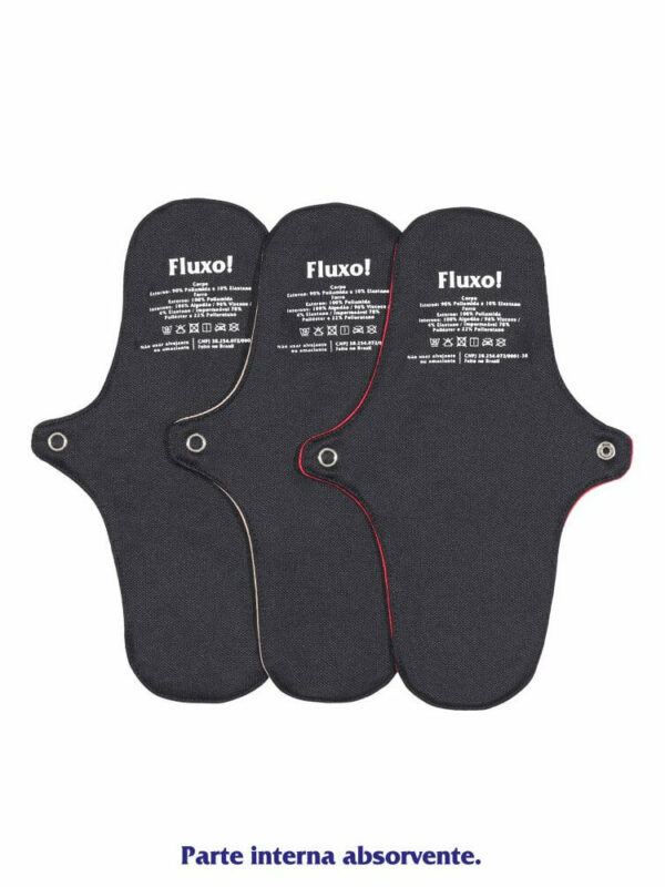 O Kit absorventes reutilizáveis Fluxo! contém 3 absorventes reutilizáveis – Fluxo leve, sendo um na cor preta, um na cor nude e um na cor vermelha.
